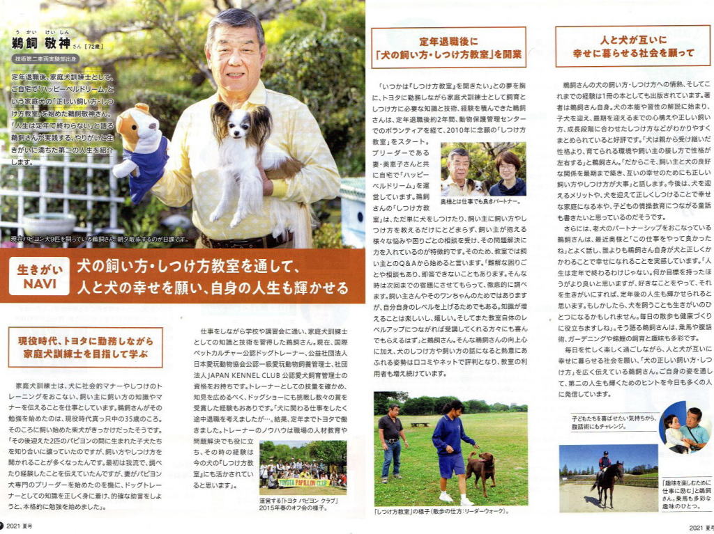 昭和24年 4月14日 愛知県一宮市にて長男として生まれる。 小学校の頃は 勉強より遊びが好きのわんぱく坊主。 小さい頃より生き物の世話が好きで小学4年に “伝書鳩” を飼い、友人達と鳩レースで明け暮れていました。 他にも ウサギ・鶏・十姉妹等を飼養。 高校(滝高等学校)に入ると “機械いじり” が好きになり、学業そっちのけで オートバイ を分解・整備しては 友人達と 県内・隣県を走り回る。 昭和45年に “中日本自動車短期大学” を卒業し 好きな自動車の仕事に就きたく、愛知県豊田市の ”トヨタ自動車” へ入社。 トヨタ自動車在籍中の昭和56年に、小さい頃より生き物が好きな事もあり “柴犬” を 3頭(絵里華号♀・富士美号♀・ 紅豊龍号♂)を迎い入れ “日本犬保存会” に所属し、毎年春と秋の ”愛知県大会” に出陳し、昭和59年の秋の 愛知県大会で、牡の 紅豊龍号 が 若二の部で “六席” を受賞。 これをきっかけに私の犬への情熱が高まり、トヨタ自動車 に勤務する傍ら、犬との生活が始まりました。 しかし3頭の柴犬達は14〜17歳の寿命で生涯を終えましたが、犬への愛着が忘れられず現在の住まいに引越し した平成11年に、“パピヨン” を 2頭(ハッピー♀・ベル♂)迎えました。 その“パピヨン”(ハッピー&ベル)の子パピ達が、知人や友人の方達にお譲り致しましたところ大変喜ばれ、ただ お譲りするのみでは大変申し訳なく思い、トヨタ自動車へ勤務しながら休日に “国際ペットカルチャー(IPC) 訓練科” に通いながら本格的に “しつけトレーニング方法” を習得し、また “日本愛玩動物協会” にて 専門的に、犬に関する“法律 ・医学・栄養学・衛生学・行動学・繁殖学”等を学びながら、“JKCドッグショー” にも関心を持ち、自らハンドリングを行い出陳。 トヨタ自動車 におきましては入社から技術部の車両実験一筋で、上司・先輩の方々により、会社のモットーでもあり ます“ものの見かた 考え方”、“良い車つくりは人つくりから”、“良い品 良い考え” のうえでご指導を頂き、 大変感謝致しております。 特に最後の6年間は 教育事務局を任せられ、人材育成・職場のレベルアップの教育推進を担当させて頂きました ことは貴重な体験となりました。 平成21年の5月1日を持ちまして、40年間の永きにわたりお世話になりました トヨタ自動車 を定年退職し、残り の人生を トヨタ自動車で培ってきました多くの知識・考え方を活かしたく、幼い頃からの夢でもありました自身の好きな 生き物に関した道を歩みたく チャレンジ中です。 その後は、“NPO法人”に入会し「愛知県動物管理センター本所」 のお手伝いとして、犬の “しつけ方相談・犬との ふれあい活動(保育園・老人施設)” に、やり甲斐と生き甲斐 を持ち 毎日を有意義に楽しく過ごしています。 そして現在は 良きブリーダー ・良きドッグトレーナー を目指して “JAHA” にて勉強中です。 H 30年 1月 ・・・・・・・・・・・・・・・・・・・・・・・・・・・・・・・・・・・・・・・・・・・・・・・・・・・・・・・・・・・・・・・・・・・・・・・・・・・・・・・・・・・・・・・・・・・・・・・・・・・ 昭和45年 3月 中日本自動車短期大学 自動車工学科 卒業 昭和45年 4月〜 平成21年4月 トヨタ自動車 技術部勤務 (車両開発業務・教育事務局) 平成 5年 5月〜 平成21年4月 トヨタ ボランティアセンター会員 平成13年 1月〜 「ハッピーベル ドリーム ケンネル」 設立 平成15年 4月〜 パピヨン倶楽部 愛知支部 「トヨタ パピヨン クラブ」 発足 平成18年 9月〜 「ハッピーベル オーナーズ 」 発足 平成21年 5月〜 NPO法人 「しっぽ・いっぽの会」 会員 平成21年 9月〜 ハッピーベル 【正しい飼い方・しつけ方教室】 開校 現 在=パピヨン飼養、錦鯉飼育、ガーデニング、乗馬、サッカー・野球観戦、クラシック鑑賞 二級ガソリン自動車整備士、 二級ディーゼル自動車整備士 職業訓練自動車整備課指導員 化学物質取扱主任、 劇毒物取扱主任、 危険物甲種取扱主任 X線取扱主任、 ガス溶接取扱主任、 安全衛生管理者 大型自動車免許、 自動二輪車免許、 高所作業車免許、クレーン車免許、フォークリフト免許 法人免許 柔道初段、書道一級、樹木医、日赤救出救護員 犬関係 動物取り扱い業 ; 販売、訓練 国際 ペットカルチャー (IPC) ; ドッグトレーナー (訓練士) 社団法人 日本愛玩動物協会 ; 一級愛玩動物飼養管理士 (一級アドバイザー) 社団法人 JAPAN KENNEL CLUB ; 愛犬飼育管理士 飼養犬種 ; 柴犬(3頭) 1981年〜1998年(日本犬保存会員) パピヨン(10頭) 1999年〜 (JKC会員) ・習字大会(小2);金賞 ・写生大会(小4);優秀賞 ・作文応募(小4);優秀賞 ・市水泳大会平泳ぎ50m(小6);優勝 ・市相撲大会(小6);3位 トヨタ自動車株式会社 ・ふれあい作文;最優秀賞、優秀賞('78、'82、86年) ・弁論大会 ;優秀賞('85年) ・品質管理大会 ;銀賞、最優秀賞('83、88年) ・発明考案 ; 功労賞('91年) ・創意工夫 ; 銅賞('03年) ・トヨタアイデアオリンピック ; 金賞、銅賞、優秀賞('83、'87
